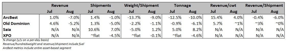 Midquarter updates issued earlier this month by public carriers showed y/y tonnage declines were worse on average in August (down 3%) than in July (down 2%). Saia was the lone outlier as its tonnage grew 8% y/y in August after a 5% increase in July.