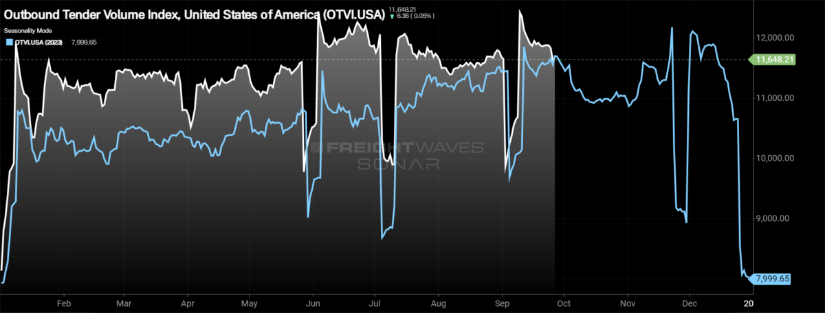 The Outbound Tender Volume Index (OTVI), a measure of national freight demand that tracks shippers’ requests for trucking capacity, is down 1.94% week over week as volumes took another leg lower to close out the month. The gap with year-ago levels is now as narrow as it has been all year, up just 0.07% year over year.
