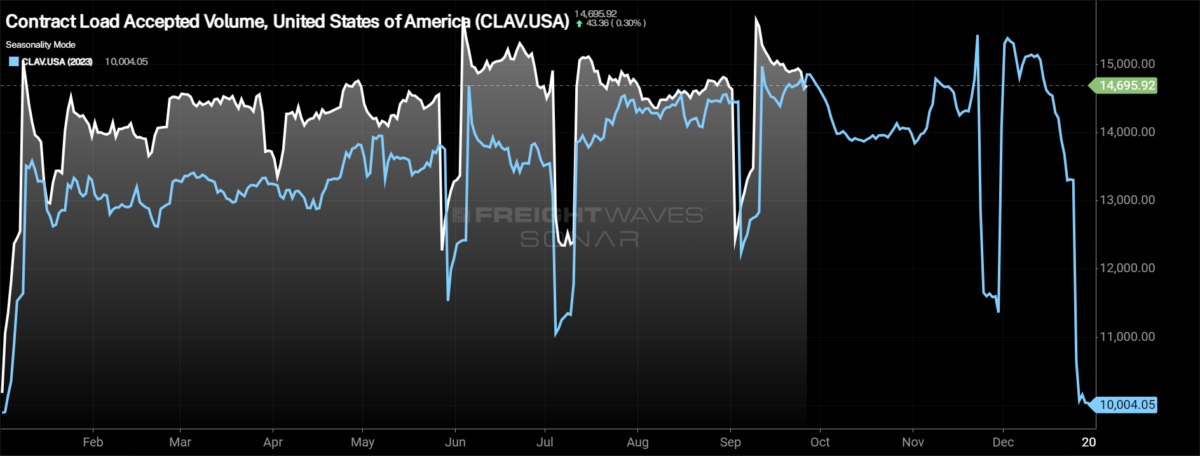 Contract Load Accepted Volume (CLAV) is an index that measures accepted load volumes moving under contracted agreements. In short, it is similar to OTVI but without the rejected tenders. Looking at accepted tender volumes, we see a decrease of 1.52% w/w. The smaller decrease than the OTVI is due to tender rejection rates dropping over the past week.