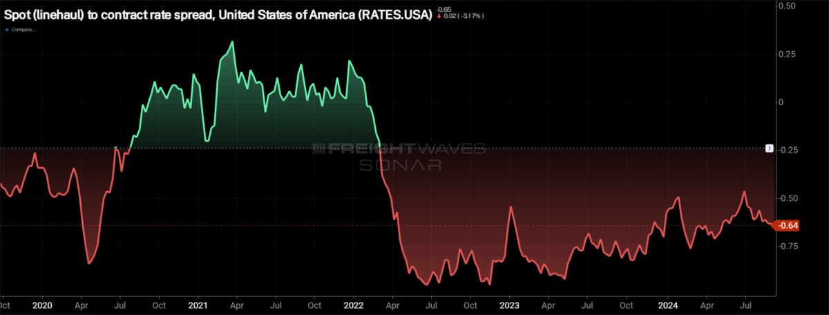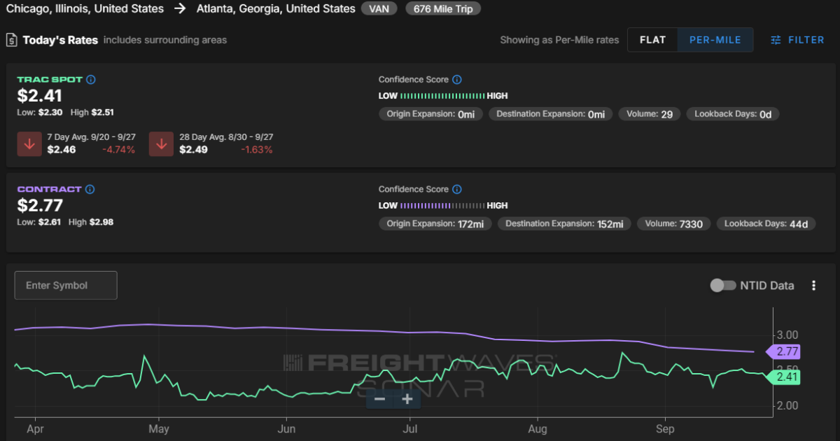 From Chicago to Atlanta, spot rates gave back some of the recent increases. The FreightWaves TRAC spot rate along this lane fell by 12 cents per mile to $2.41, now 36 cents per mile below the contract rate.
