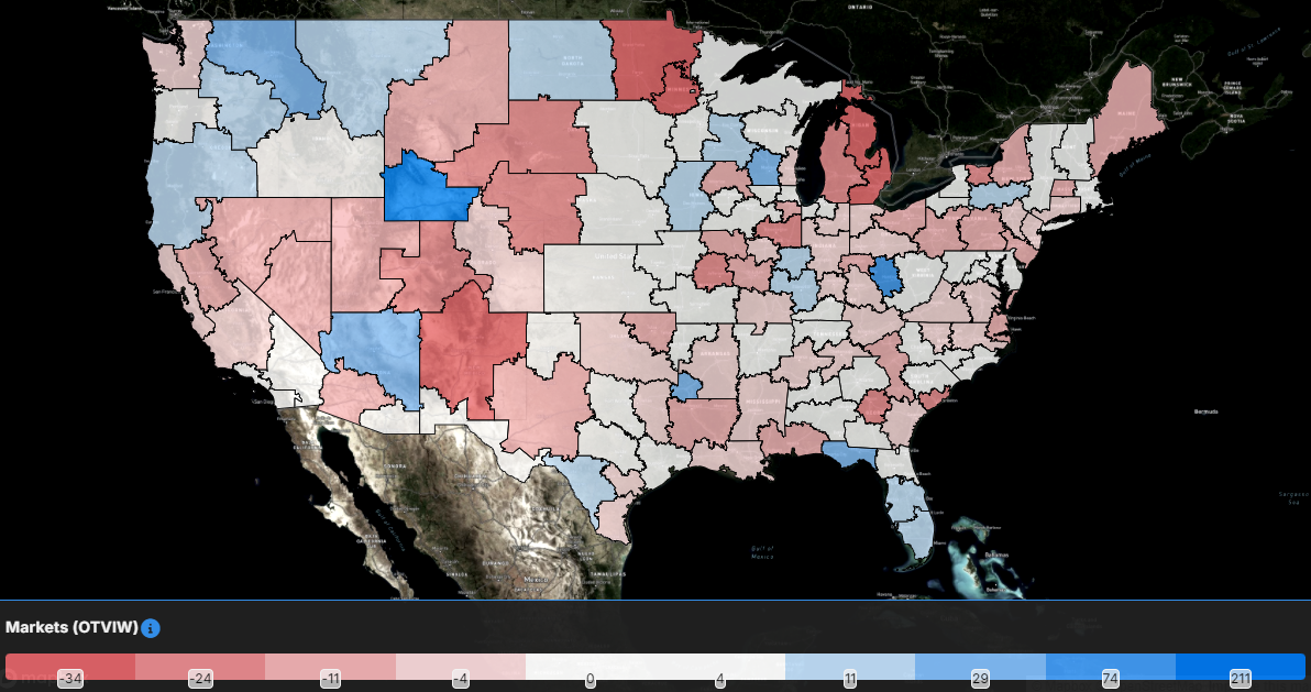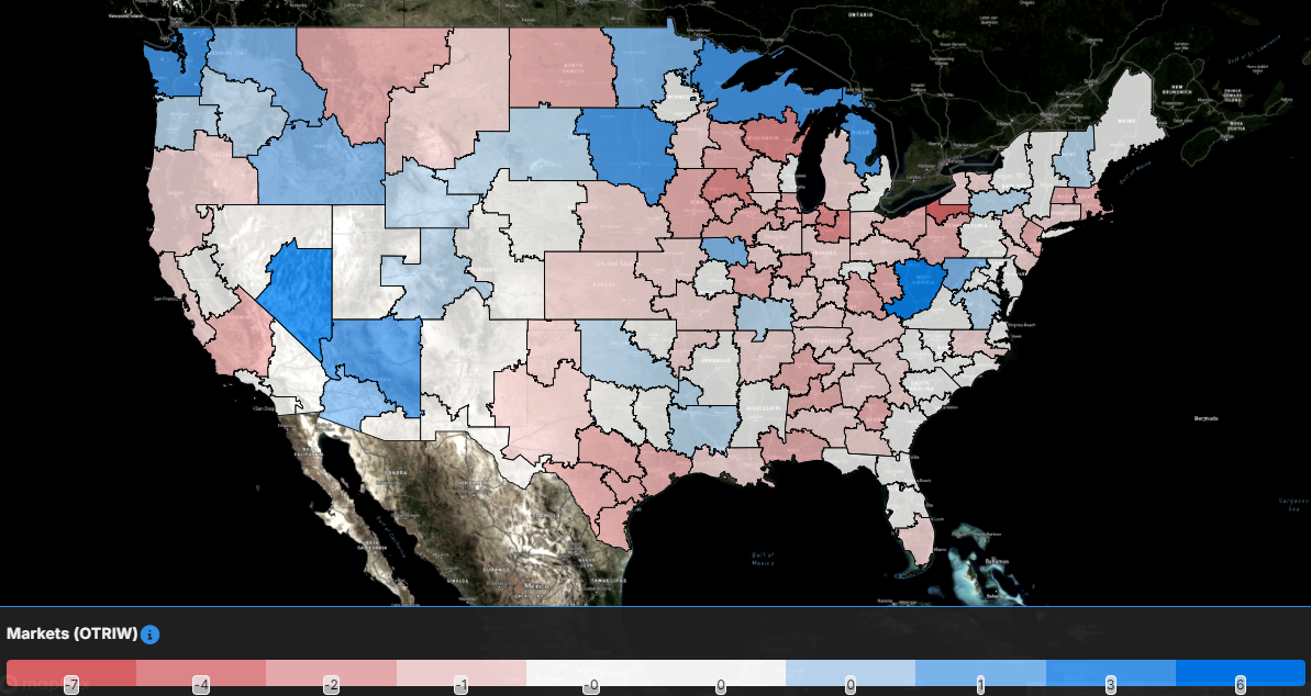 The map above shows the Outbound Tender Reject Index — Weekly Change for the 135 markets across the country. Markets shaded in blue are those where tender rejection rates have increased over the past week, whereas those in red have seen rejection rates decline. The bolder the color, the more significant the change.