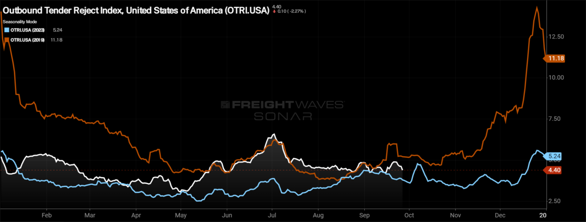 Over the past week, the Outbound Tender Reject Index (OTRI), a measure of relative capacity, decreased by 21 basis points to 4.4%, approaching the lows seen immediately after the Labor Day holiday. The OTRI is now 66 basis points above last year’s levels, a signal that while it doesn’t feel tighter because rejection rates are still below 5%, rejection rates are higher in aggregate. The market has diverged from the 2019 levels in recent weeks, as the OTRI is 82 bps below where it was this time in 2019.