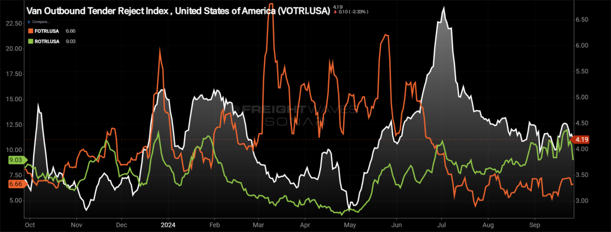 By mode: The dry van market was showing some positive signs throughout the middle of September, but that was short-lived. The Van Outbound Tender Reject Index fell by 28 bps over the past week to 4.19%.