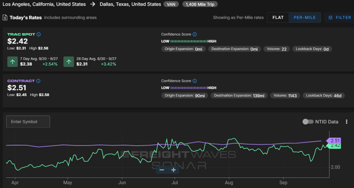 The FreightWaves Trusted Rate Assessment Consortium spot rate from Los Angeles to Dallas continued to move higher over the past week. The TRAC rate from Los Angeles to Dallas increased by 6 cents per mile to $2.42. Spot rates along this lane are now just 9 cents per mile below the contract rate.