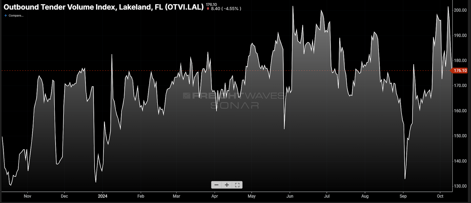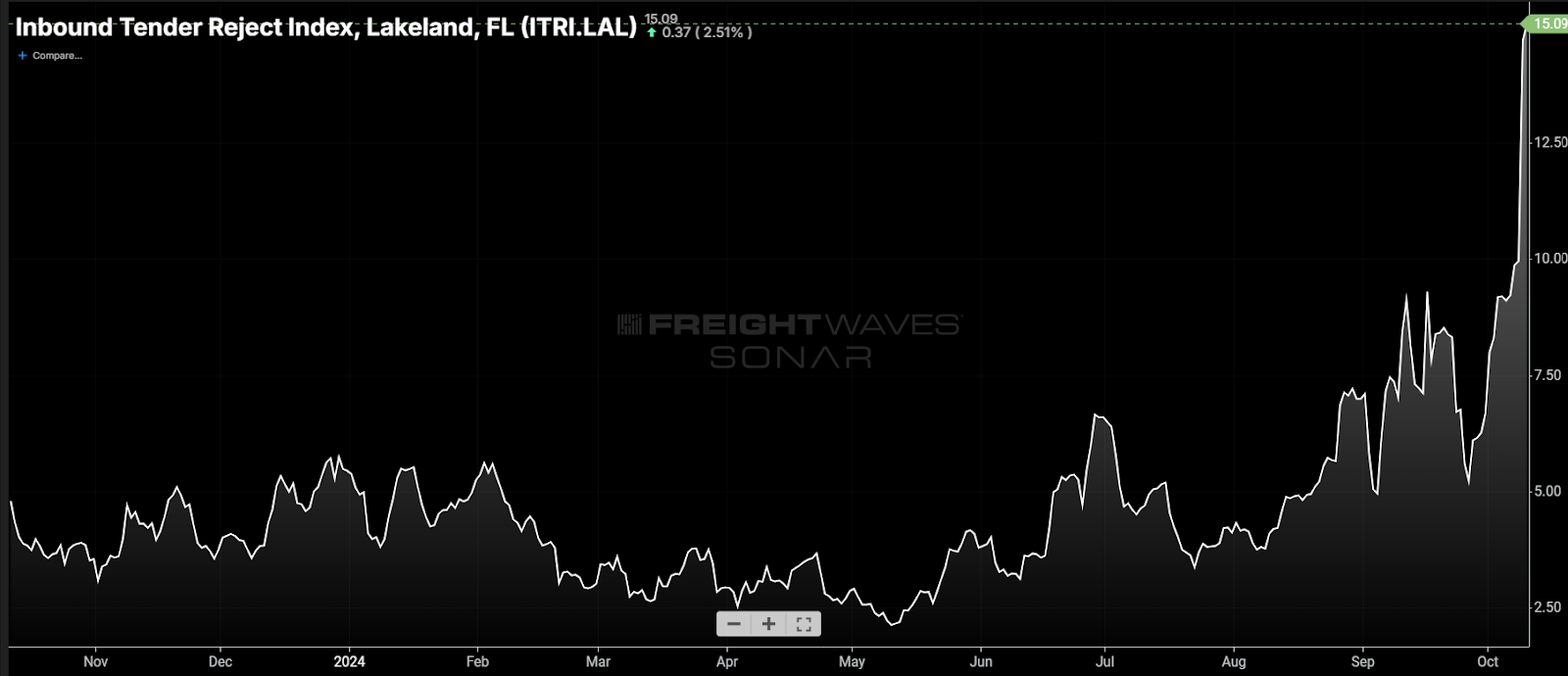 Inbound tender rejection rates for the Lakeland market in central Florida spiked to over 15%, the highest value since the pandemic era ended in early 2022.