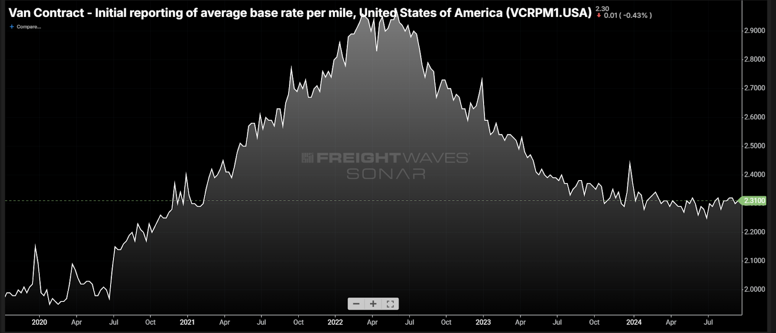 Contract rates are showing signs of bouncing off the floor in an environment that they could still be moving lower. National truckload dry van contract rates are down roughly 2% y/y but flat over the past six months and up 1% over the past quarter.