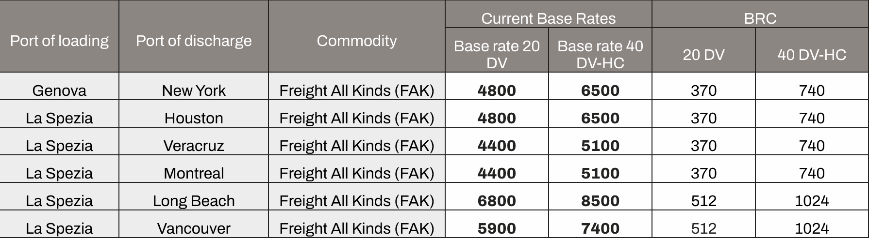 The existing freight rates remain unchanged. For reference, these rates are available below. All prices are quoted in US Dollars unless otherwise indicated.