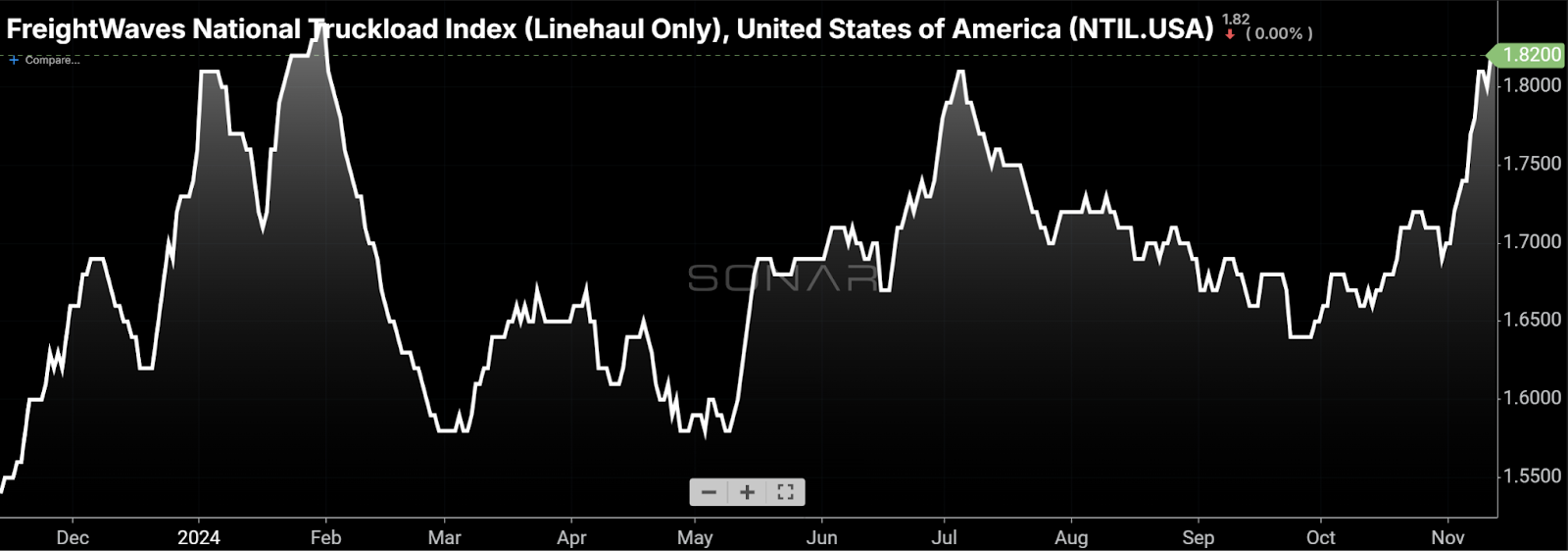 Spot market conditions for carriers continue to rapidly improve against a backdrop of ongoing diesel price declines. The rapid surge in spot market linehaul rates began in November and has reached its highest level since Feb 1. In the past week, the FreightWaves National Truckload Index (Linehaul Only) rose 8 cents per mile from $1.74 on Nov. 4 to $1.82. Compared to this time last month, the NTIL is up 15 cents per mile from $1.67 on Oct. 12.