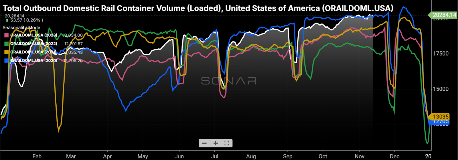 October is historically the strongest month for domestic intermodal volume, and sometimes there is retraction in early November, which can be seen in the chart above in 2022 (green line) and 2023 (pink line). So far this year, there hasn’t been any retraction in volume in November (white line – up 6.8% y/y this month and 4.8% y/y for all of Q4 to date), and domestic intermodal volume has traded roughly in line with the seasonal trend of the extraordinarily strong late 2020.