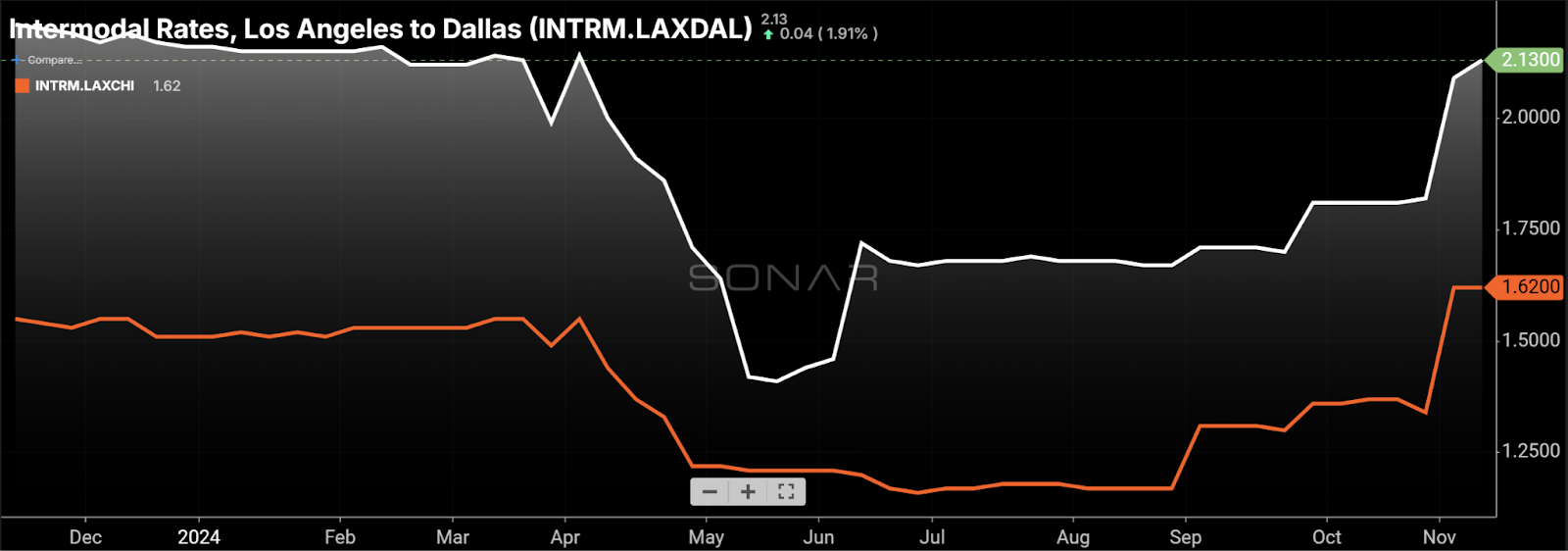 Amid that expectation for volume strength, intermodal spot rates have risen in some of the dense long-haul corridors. Since the start of the month, the intermodal spot rate from LA to Chicago increased from $1.82 a mile to $2.13 a mile, and the rate from LA to Dallas increased from $1.34 to $1.62. That suggests carriers might be getting a little more concerned with keeping containers available for the higher-priority contractual shippers. Comparing those intermodal spot rates to the truckload spot rates available in SONAR’s Market Dashboard shows that one might expect intermodal spot volume to materialize in the LA to Dallas lane (truckload spot=$2.75 a mile), but not in the LA to Chicago lane (truckload spot=$1.78 a mile).