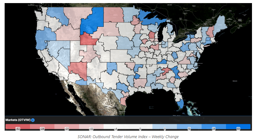 Freight flow – FreightWaves reports, “The Outbound Tender Volume Index (OTVI), a measure of national freight demand that tracks shippers’ requests for trucking capacity, had one of its strongest weeks as volumes have increased by 2.91%.” Dry van OTVI is 8.3% higher now than it was one year ago.