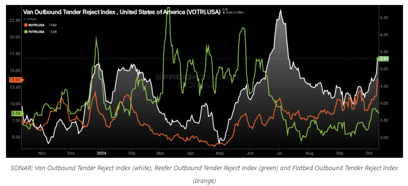 Rejections – Looking at the measure of contracted loads that are rejected (usually untenderly), we’re above 5%, which is considered the right direction toward normalization and recovery. Markets impacted by the storm or port strike saw the biggest bumps – especially those near Savannah, Georgia; Jacksonville, Florida; Atlanta; and Elizabeth, New Jersey.
