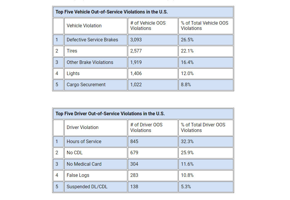 The downside was inspectors found 13,567 vehicle, 2,714 driver and 163 hazardous materials/dangerous goods OOS violations, resulting in 9,345 CMV combinations and 2,290 drivers being placed OOS. Looking at this number as a percentage, the overall vehicle OOS rate was 23% while the driver OOS rate was 4.8%. If a driver or vehicle is placed out of service, that means an inspector found critical inspection item violations as outlined in the CVSA North American Standard Out-of-Service Criteria.