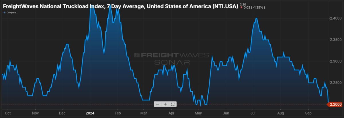 Summary: In the past week, nationwide dry van spot market rates reached levels not observed since May amid an unabated decline in spot rates since the July Fourth holiday. The first days of fall may herald a change in foliage, but the glut of excess truckload capacity remains unchanged in the spot market space. The FreightWaves National Truckload Index 7-Day average fell 4 cents per mile all-in w/w from $2.24 on Sept. 16 to $2.20 per mile. The last time spot rates were at $2.20 per mile all-in was May 10. Year to date, the NTI is down 23 cents per mile following signs of a favorable fourth quarter and winter weather. Compared to this time last year, spot rates are 7 cents per mile lower from $2.27 on Sept. 24.