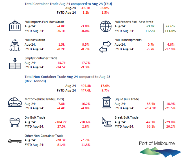 At the same time, August’s total empty container movements were down in Melbourne agaist prior year’s figures.