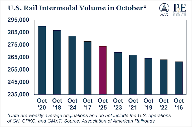 Conversely, intermodal rail shipments, a crucial component of rail freight traffic, declined. October 2025 saw a 3% reduction compared to the same month in the previous year, marking the third decline in five months. Normally a peak month for intermodal traffic, October underperformed, failing to rank among the top for average weekly volume. Contributing factors include a manufacturing slowdown, consumer spending shifts towards services, and alterations in ocean shipping patterns that hinder the typical seasonal growth. The pause in the tariff war fueled an early peak season as importers rushed to frontload goods from Asia, leading to weaker demand after the summer.