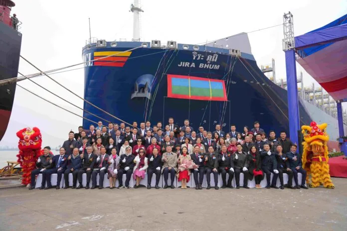 Jira Bhum, a 7,000 TEU container ship, was officially named on 10 December 2024, during a celebratory event at Jiangsu New Hantong Ship Heavy Industry in China. The occasion was graced by Police General Adul Sangsingkeo, accompanied by Aranya Sangsingkeo, who served as the Sponsor Lady. The event also saw the presence of RCL’s senior management team, including Dr. Jamlong Atikul Chairman, Sumate Tanthuwanit, Chairman of the Executive Committee, and Dr. Twinchok Tanthuwanit, President of RCL.