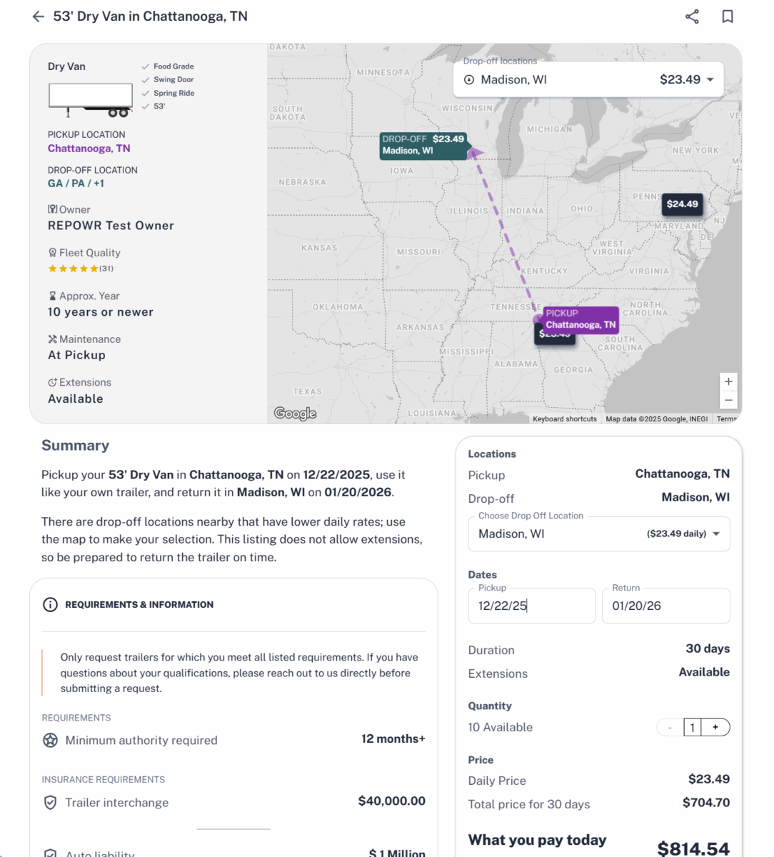 The REPOWR report also lists other data coming from its own operations. It says its rental range for a dry van is between $530-$610 per month. Same-day availability is 72%. The average earnings per listed trailer are $900.38 per booking for the company supplying the equipment.