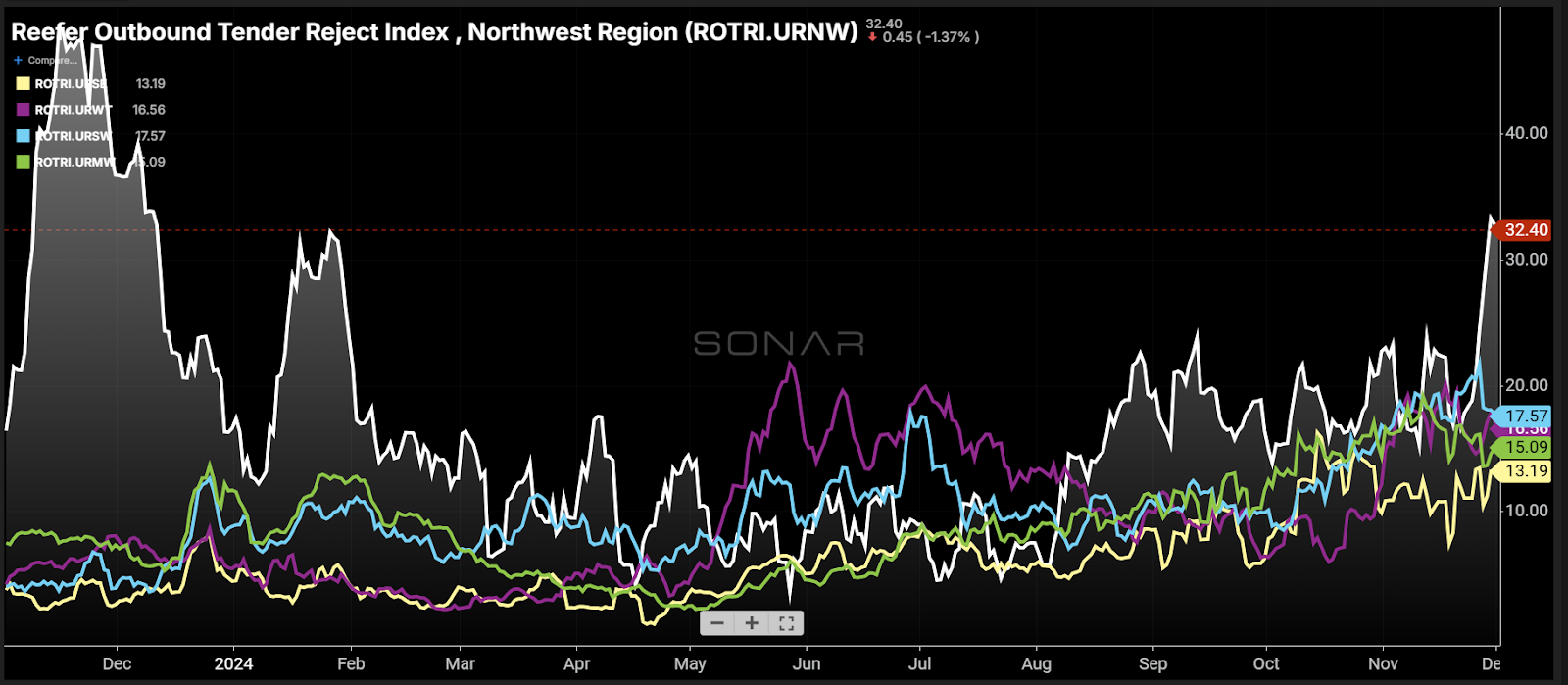 National reefer rejection rates are double what they were at this time last year, remaining above 15% for most of the past month. Thanksgiving week typically marks the beginning of Christmas tree season, which impacts the Northwest more than any other region of the country. According to the U.S. Department of Agriculture, most Christmas trees sold in the U.S. are sourced from Oregon and North Carolina. Trees grown in the Northwest generally need to travel much farther, supplying a broad portion of the West Coast. In contrast, trees from North Carolina tend to stay within the region, as the Northeast has a higher density of tree farms.
