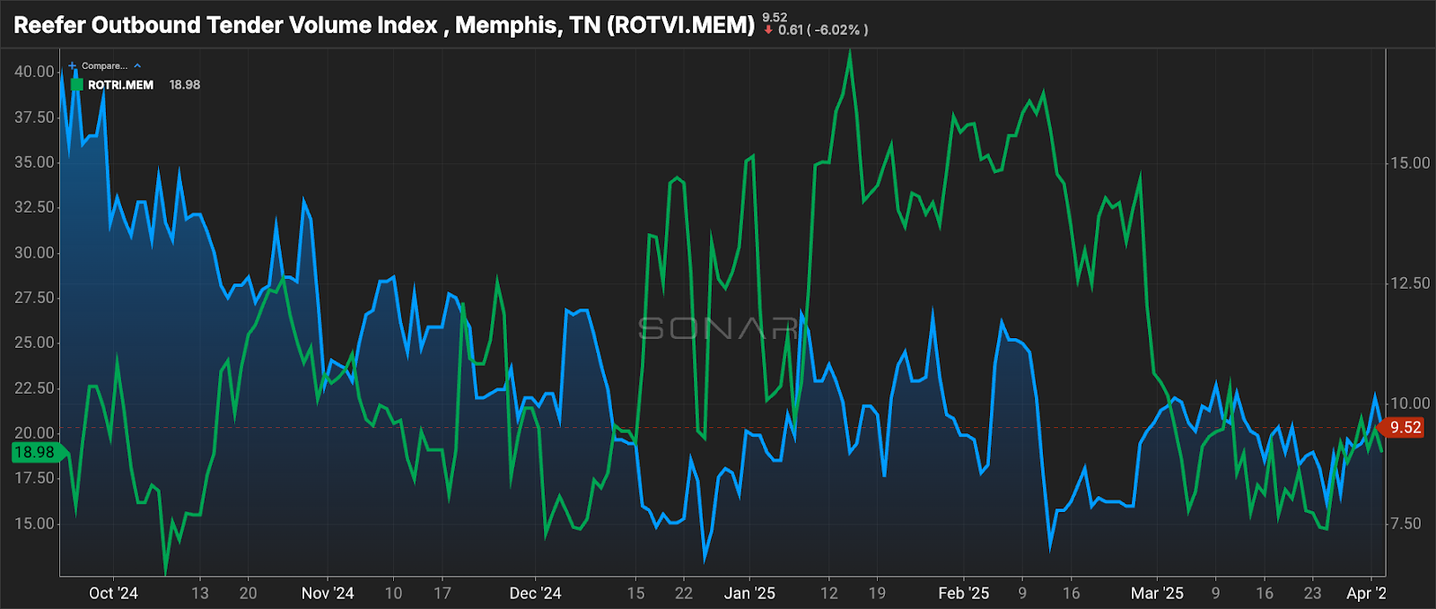 Capacity in Memphis will be tighter now compared to seasonal averages. For comparison, this time last year the ROTRI was at 4.81% versus the current 18.98%. This indicates that there are elevated spot rates in the market. Given that the 100 days of summer are right around the corner and produce season stands to ramp up over the next few weeks, it’s unlikely there will be loosening capacity in Memphis anytime soon.