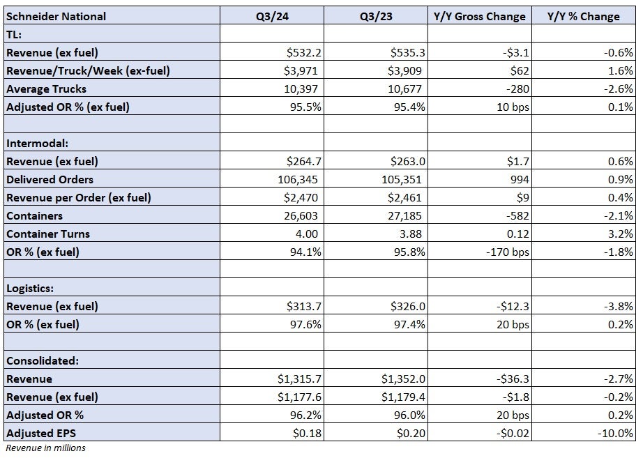 Schneider (NYSE: SNDR) reported adjusted EPS of 18 cents in the third quarter, which was 5 cents worse than the consensus estimate and 2 cents lower year over year. Lower gains on both equipment sales and equity investments presented a 4-cent y/y drag. It also said higher insurance and claims costs were a 4-cent headwind even though incident frequency declined.
