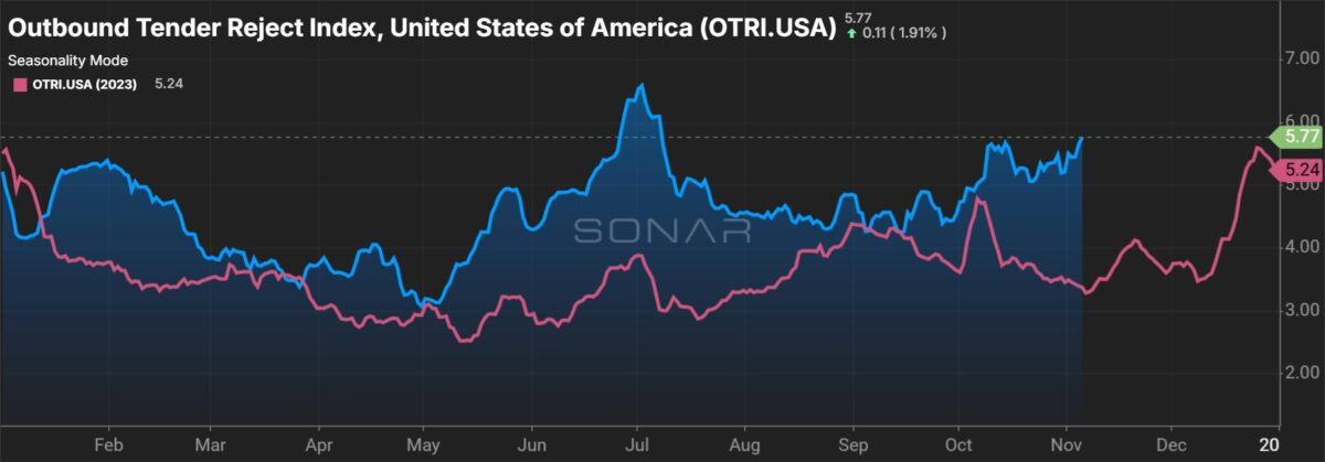 Chart: (SONAR: OTRI.USA). A proxy for truck capacity, the Outbound Tender Reject Index, shows the number of loads being rejected by carriers. To learn more about SONAR, click here.