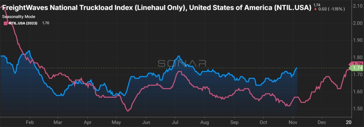 Chart: (SONAR: NTIL.USA). The National Truckload Index (linehaul only – NTIL) is based on an average of booked spot dry van loads from 250,000 lanes. The NTIL is a seven-day moving average of linehaul spot rates excluding fuel.