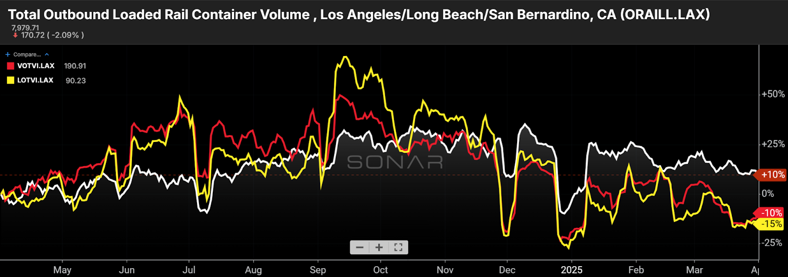 The spread between containerized intermodal volume (white line) and truckload tenders (represented by the red and yellow lines for dry van and long-haul, respectively) is even wider than the national average, relative to this time last year, when looking at outbound LA volume only. (Chart: SONAR)