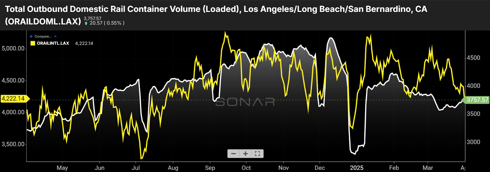 Outbound from LA, international intermodal volume grew faster than domestic intermodal volume, suggesting there was less transloading. (Chart: SONAR)