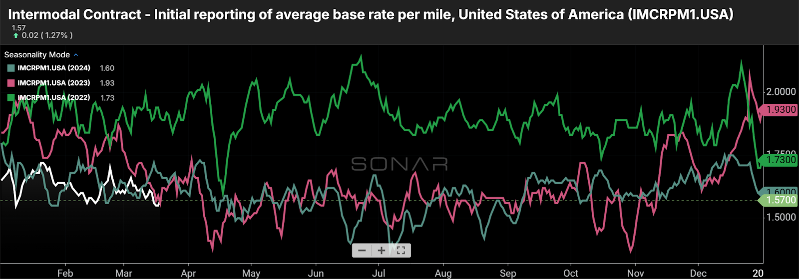 Domestic intermodal contract rates in SONAR have not moved much in the first quarter, apparently held back by excess capacity (a proxy of which is available 53-foot containers) and competition from truckload. A large portion of the contracts between shippers and domestic intermodal carriers are renewed in the first quarter. That makes the IMCRPM1.USA dataset (chart above), which is an aggregation of intermodal contract rates excluding fuel surcharges, one to watch. It’s worth noting that there is choppiness in that dataset week to week due to mix. Year to date, the data shows average intermodal rates 1.5% below last year. That’s a fairly insignificant change that could be driven just by the mix of transactions processed in the database, and also shows a lack of rate increases in the quarter.
