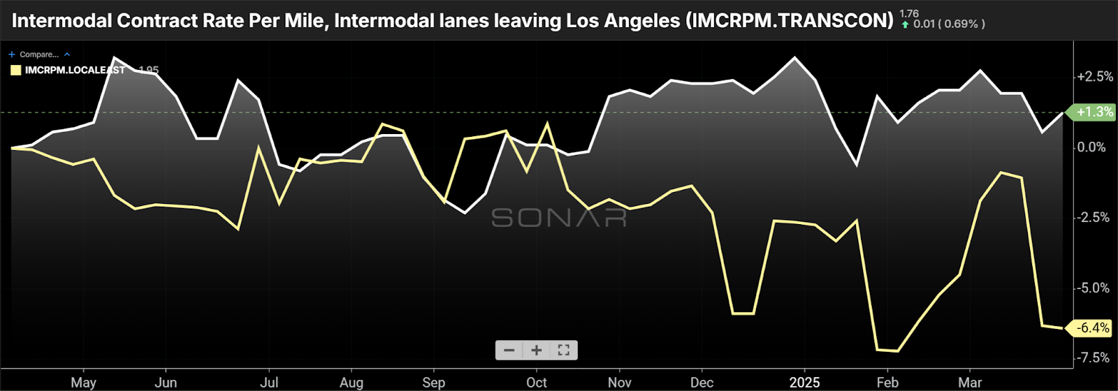Meanwhile, SONAR is showing significant differences between changes in rates for transcontinental headhaul lanes, where intermodal has a competitive advantage over truckload, and lanes in the eastern U.S., where intermodal faces more direct competition from highway carriers. The Transcon Headhaul Index, which is an average of the five densest outbound LA lanes and includes fuel, was flat year over year, on average, in the first quarter. Meanwhile, the Local East Index, which is an average of nine dense lanes and includes fuel, was down an average of 6% year over year in the first quarter. Looking at just the most recent data points in March (IMCRPM.TRANSCON and IMCRPM.LOCALEAST on a relative basis), the Transcon and Local East indexes are up 1.3% and down 6.4%, respectively, versus this time last year.