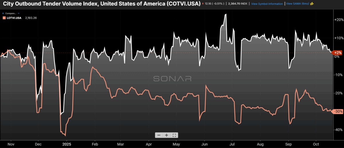 It wasn’t all positive. SONAR measures the Outbound Tender Volume Index for short-haul versus long-haul freight. Fuller said the sharp divergence of the two in recent months is an extremely bearish sign for manufacturing in the U.S.