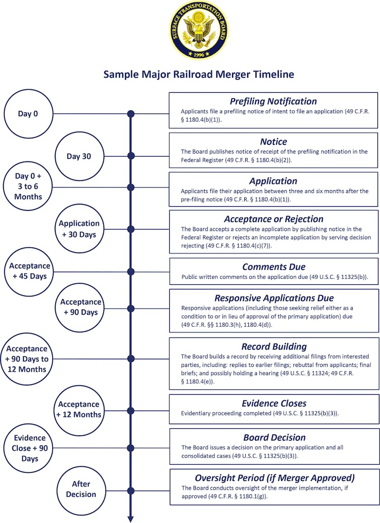 The STB’s information includes a sample timeline that depicts how a Class I railroad merger application might flow through the regulatory review process. That process — from railroads notifying the board of their intent to merge to a review of the application and final decision — would play out over a 19- to 22-month period.