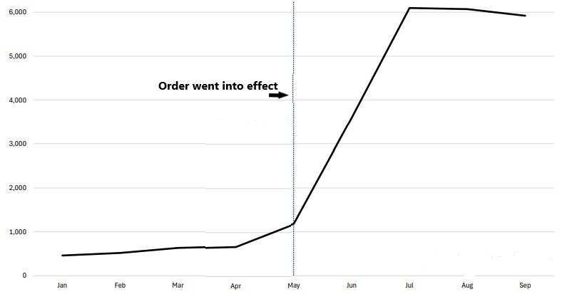 The study also revealed a “steady uptick” in enforcement in June and July, following President Trump’s April executive order cracking down on English language requirements for truck drivers – but not everywhere: California basically ignored the order, the research found, with state inspectors there citing fewer ELP violations after the order was issued compared to before.