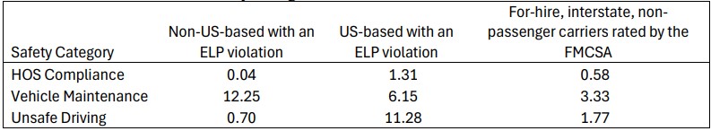 Using roadside inspection data from May 1 through September 21, the study found that inspections with an ELP violation had 2.5 times the number of total non-ELP violations relative to a comparison group, and almost 3 times the rate for the most egregious driver violations.