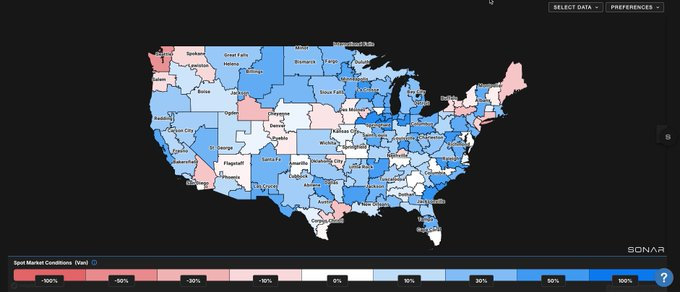 The spot market heat map in SONAR, which tracks sudden shifts in spot market rates, has turned extremely blue, indicating that spot rates are suddenly surging well beyond recent trends.