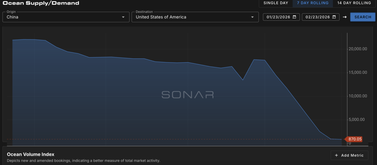 SONAR‘s Ocean Volume Index shows how China-U.S. container bookings have sharply declined since January.