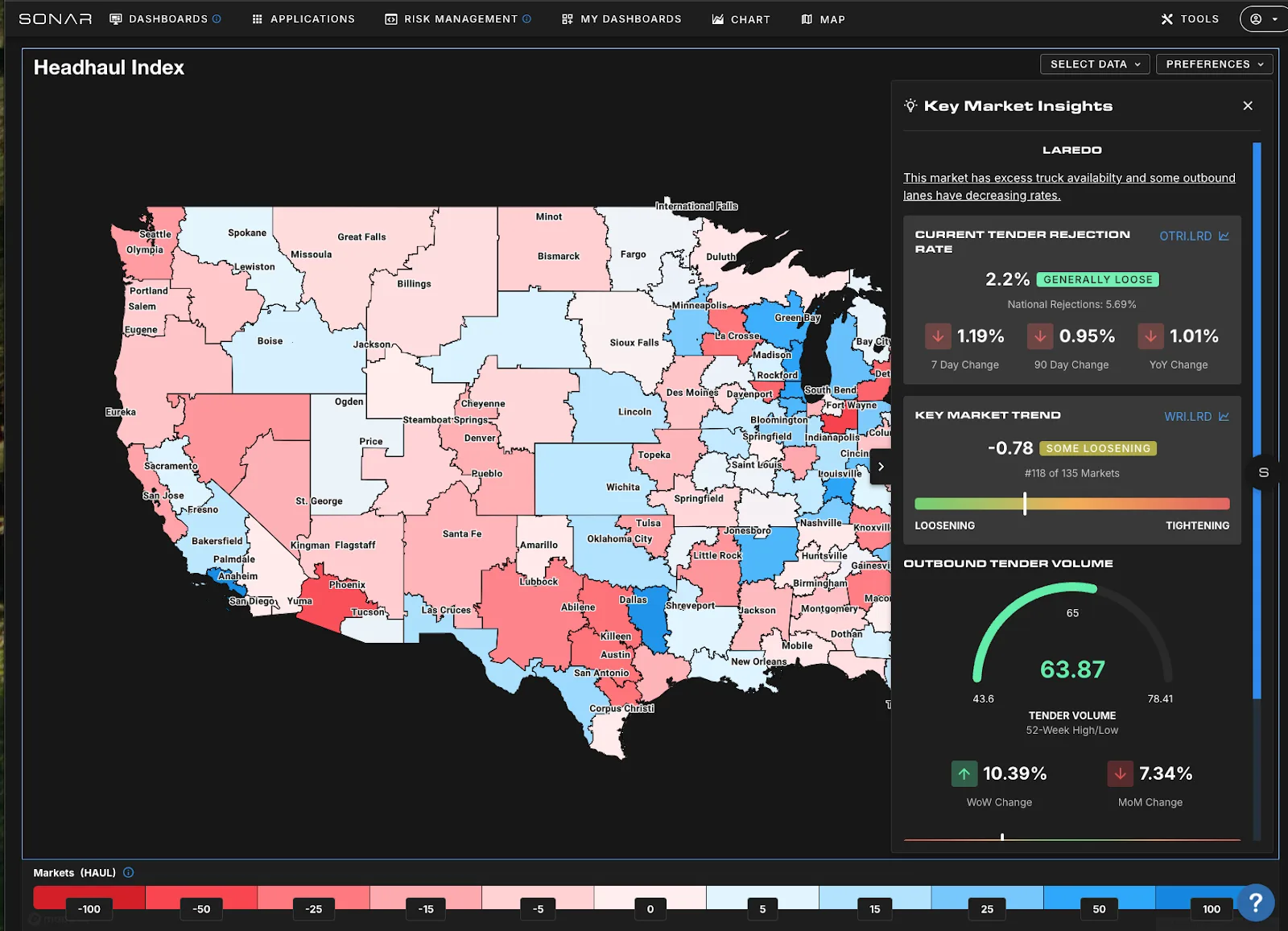 This year, leading supply chain intelligence platform SONAR has shipped new features that surface insights to its users faster than ever before, aggregating relevant data into new dashboards, adding a layer of AI analysis that quickly explains the significance of data series, and integrating with data partners to provide critical information at specific points in user workflows. SONAR also released an iOS app, Blue to Blue, to help carriers stay running in the optimal lanes for their business.