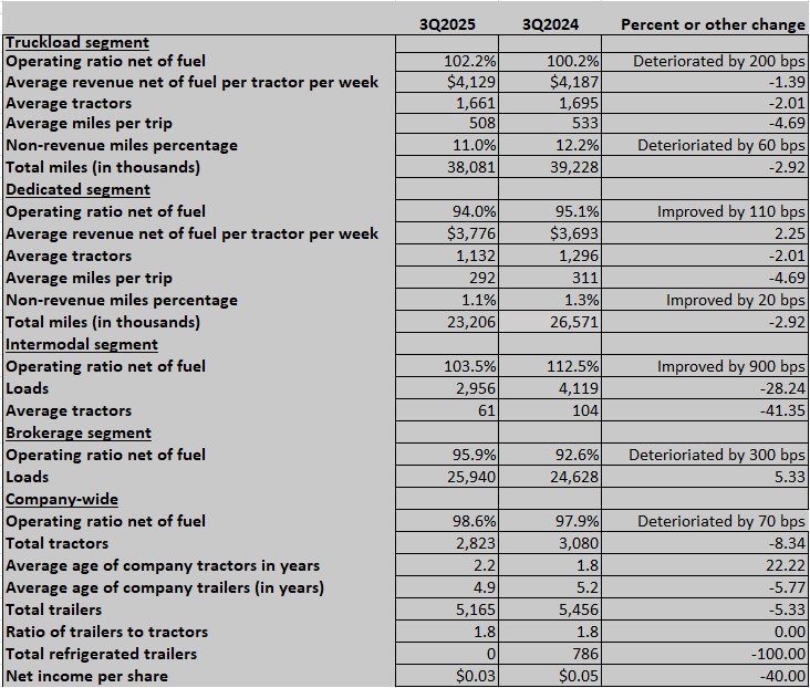 Net income at Marten declined 40.7% to $2.226 million. For the nine months, net income is down 13.4% to $13.74 million. Marten’s overall OR net of fuel for the quarter was 98.6%, compared to 97.9% a year ago.