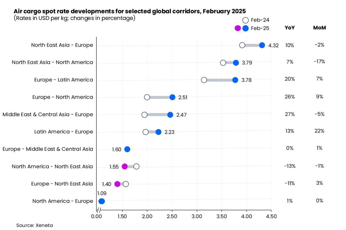 Overall, global air cargo demand grew 4% year over year in February, according to Xeneta’s latest monthly report. Volumes picked up in the second half of the month after initially being flat, which coincides with resumption of factory and warehouse activity in China with the end of the Lunar New Year holiday. Xeneta said a weighted measure that considers the earlier Lunar New Year in 2025 more accurately shows 3% growth for the combined January-February period. The diminishing impact of Red Sea disruptions on ocean shipping may also be influencing monthly performance as shippers shift out of air and sea-air shipping solutions.