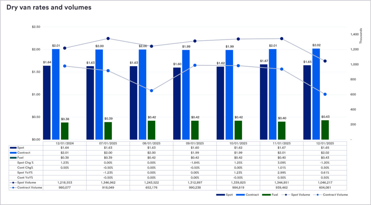 Compared with the previous year, both spot and contract rates were less than 1% higher. The report described the modest gain as reflecting “typical seasonal patterns rather than structural change, as holiday-driven demand often tempers year-over-year comparisons.” Steadier contract rates, it added, continued to provide shippers and carriers a reliable baseline.