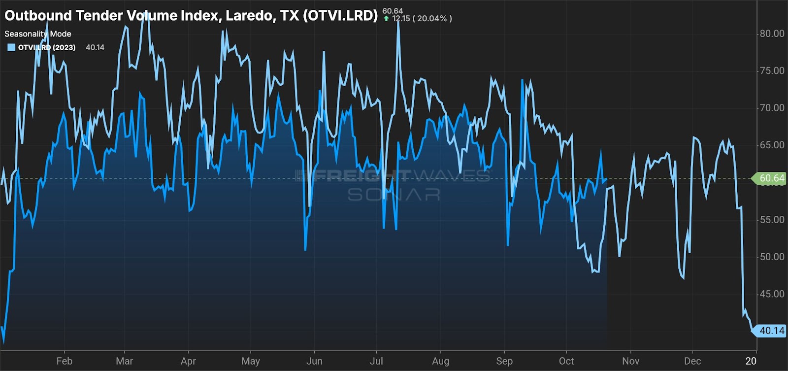 As of Sunday, the SONAR Outbound Tender Volume Index for Laredo (OTVI.LRD) was up about 3.3% year over year. The index measures national freight demand by shippers’ requests for capacity.