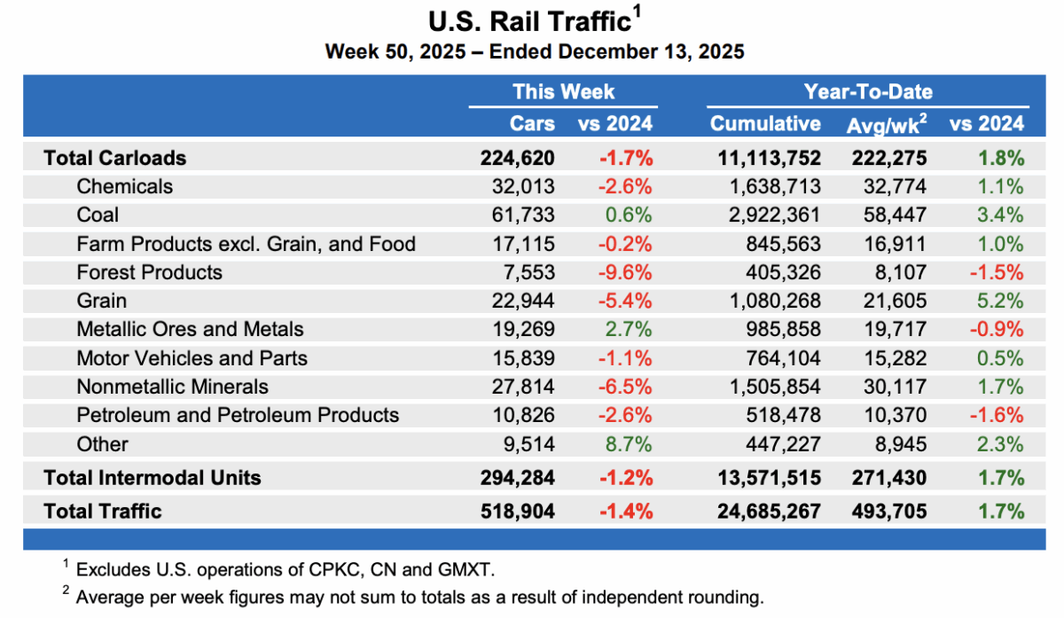 Figures for the week ending Dec. 13, 2025, show 518,904 carloads and intermodal units, a decrease of 1.4% from the same week a year ago. Both carloads and intermodal traffic were down, with volume of 224,620 carloads, a drop of 1.7% from the corresponding week in 2024, and 294,284 containers and trailers, a decrease of 1.2%.