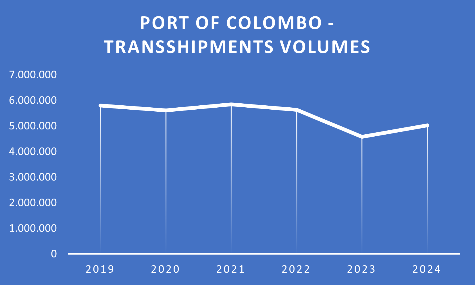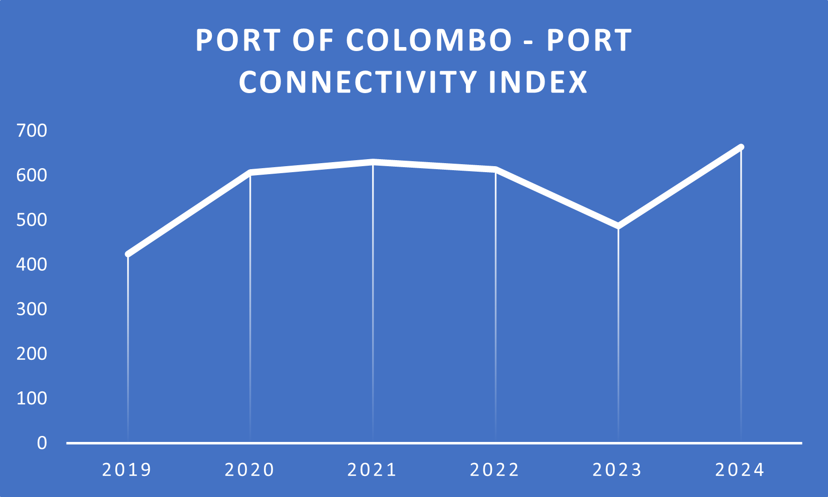 However, concerns about a potential decline in transshipment volumes at Colombo Port, linked to the expansion of Indian ports, can be observed through key performance indicators such as transshipment volumes and the Port Connectivity Index. Data shows that Colombo maintained stable volume inflows, with a slight downturn between 2022 and 2023, but recovered in 2024.