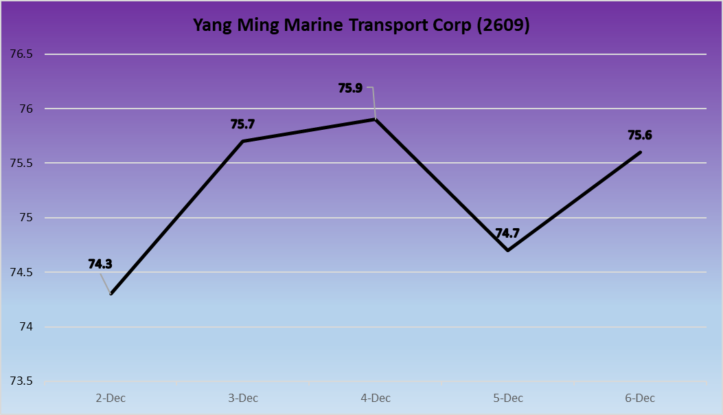 Yang Ming experienced a relatively stable week, rising slightly from NT$74.3 to NT$75.6, an increase of 1.75%. This moderate growth reflects stable operations and improvements in certain trade lanes, though the company remains vulnerable to broader market uncertainties.