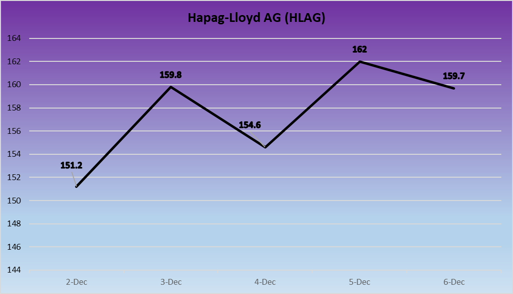 Hapag-Lloyd’s stock experienced significant swings, closing the week at €159.7, a 5.63% rise from its opening price of €151.2. Investor confidence likely reflects the company’s robust cost-control measures and diversification efforts, even amid challenges in key trade routes.