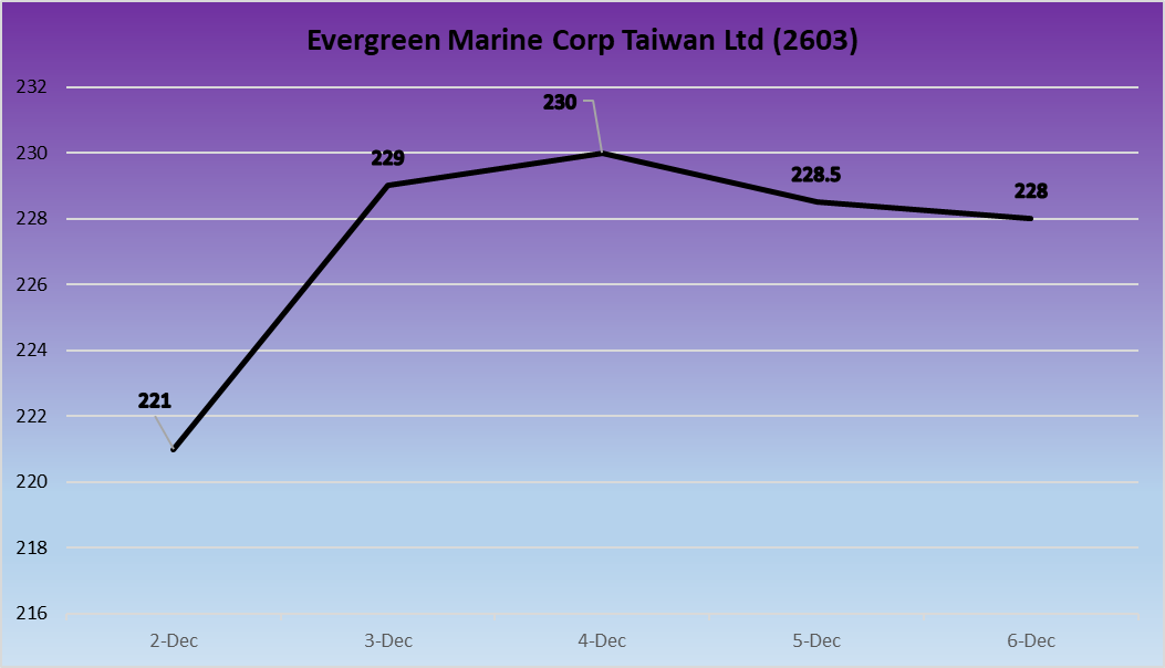 Evergreen Marine had a steady week, with its stock rising from NT$221 to NT$228, a gain of 3.17%. This performance reflects the company’s solid position in key global shipping lanes and its ability to maintain profitability despite softer market conditions.