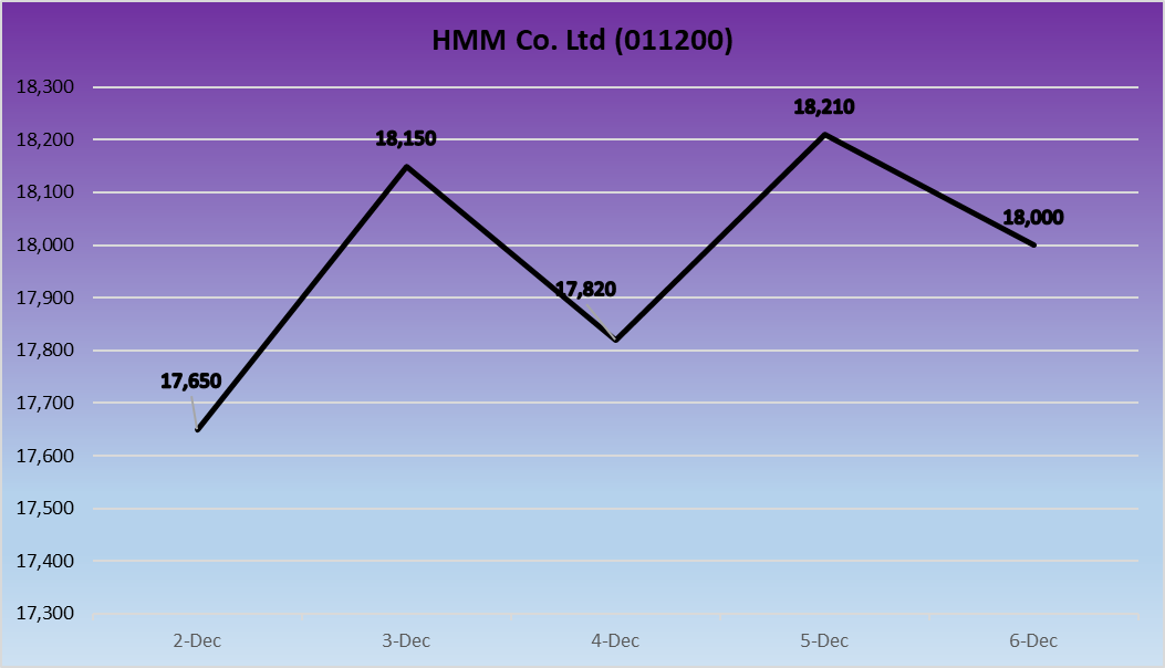HMM’s stock fluctuated but ended the week slightly down at KRW18,000, a 1.83% decrease from its opening price of KRW17,650. The company continues to face profitability pressures amid rising operational costs and subdued demand across global markets.