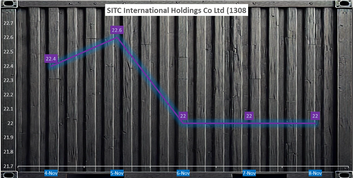 SITC’s stock showed moderate stability over the past week, with slight fluctuations. Starting at HKD 22.4 on November 4, the price climbed to HKD 22.6 on November 5 but then dropped to HKD 22.0 by November 6. No data for November 7 and 8 suggests the trend is not fully clear, but the early movements show a slight decline after an initial rise, possibly indicating market caution around SITC.