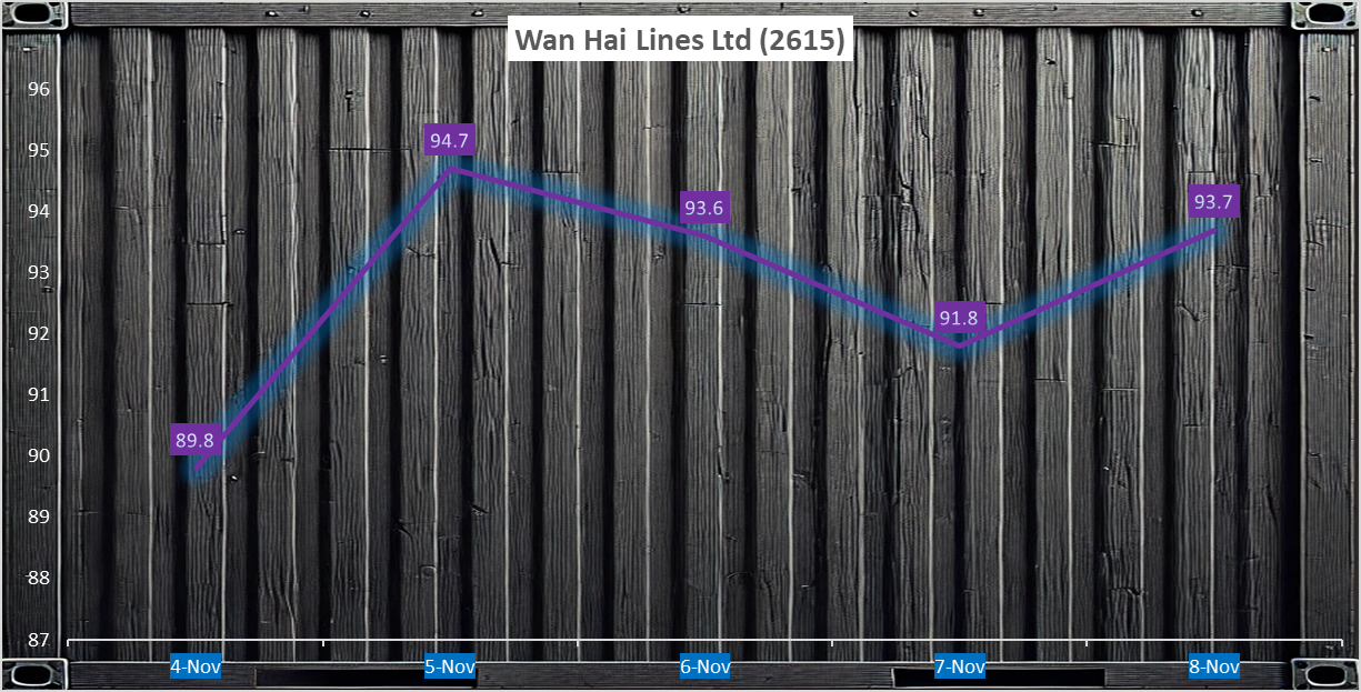 Wan Hai Lines experienced volatility within the past week, starting at TWD 89.8 on November 4 and spiking to TWD 94.7 on November 5. However, the stock price fluctuated, declining to TWD 91.8 on November 7 before rebounding to TWD 93.7 on November 8. This up-and-down movement may reflect market uncertainty about the shipping sector in the region or varying demand expectations.